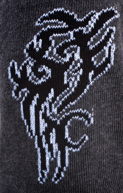 Diese Socken sind einzigartig: das Tattoo-Motiv ist in dunkelgrau mit weißem Rand und Silberfaden direkt in die Socken eingestrickt.
