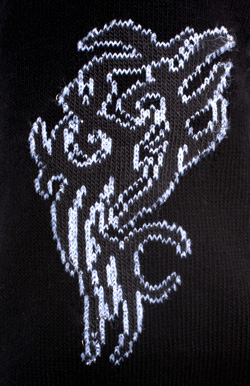 Diese Socken sind einzigartig: das Tattoo-Motiv ist in dunkelgrau mit weißem Rand und Silberfaden direkt in die Socken eingestrickt.